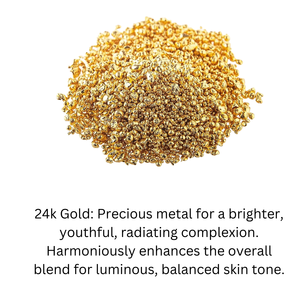 Ingredients: Water (Aqua)24K Gold, Caprylic/Capric Triglyceride, Glycerin,Green tea Extract,Cetearyl Alcohol, Tridecyl Trimellitate, Silica, Glycereth-26, Glyceryl Stearate, Cetyl Alcohol, PEG-100 Stearate, Ferocactus Wislizenii Extract (Cactus), Prunus Amygdalus Dulcis (Sweet Almond) Seed Extract, Secale Cereale (Rye) Seed Extract, Hydrolyzed Soy Protein, Yeast Extract (Faex), Retinyl Palmitate, Tocopherol, Dipalmitoyl Hydroxyproline, Cetearyl Glucoside, Cyclodextrin, Cyclopentasiloxane, Acrylates/C10-30 Alkyl Acrylate Crosspolymer, Fragrance (Parfum), Phenoxyethanol, Caprylyl Glycol, Pentylene Glycol, Sodium Phytate, Sodium Hydroxide, Titanium Dioxide (CI 77891Chondrus Crispus (Seaweed) extract, purified water (aqua), hyaluronic acid, malus domestica fruit cell culture, xanthan gum, glycerin, lechithin, phenoxyethanol, ethylhexyglycerinWater (Aqua) 24K Gold, Caprylic/Capric Triglyceride, Glycerin, Green Tea Extract, Cetearyl Alcohol, Tridecyl Trimellitate, Silica, Glycereth-26, Glyceryl Stearate, Cetyl Alcohol, PEG-100 Stearate, Ferocactus Wislizenii Extract, Secale Cereale (Rye) Seed Extract, Hydrolyzed Soy Protein, Yeast Extract (Faex), Retinyl Palmitate, Tocopherol, Dipalmtoyl Hydroxyproline, Cetearyl Glucoside, Cyclodextrin, Cyclopentasiloxane, Acrylates/C 10-30 Alkyl Acrylate Crosspolymer, Fragrance (Parfum), Phenoxyethanol, Caprylyl Glycol, Pentylene Glycol, Sodium Phytate, Sodium Hydroxide, Titanium Dioxide (C177891)